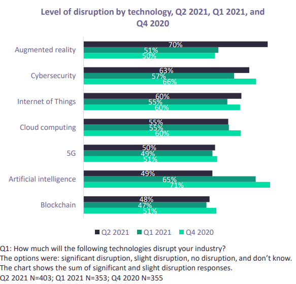 Businesses are always concerned about data privacyand security regardless of sector. So it’s perhaps unsurprising to see cybersecurity ranking as the most disruptive technology in the present moment. It has occupied this spot since Q4 2020, this time around ranked top by 62% of respondents.
